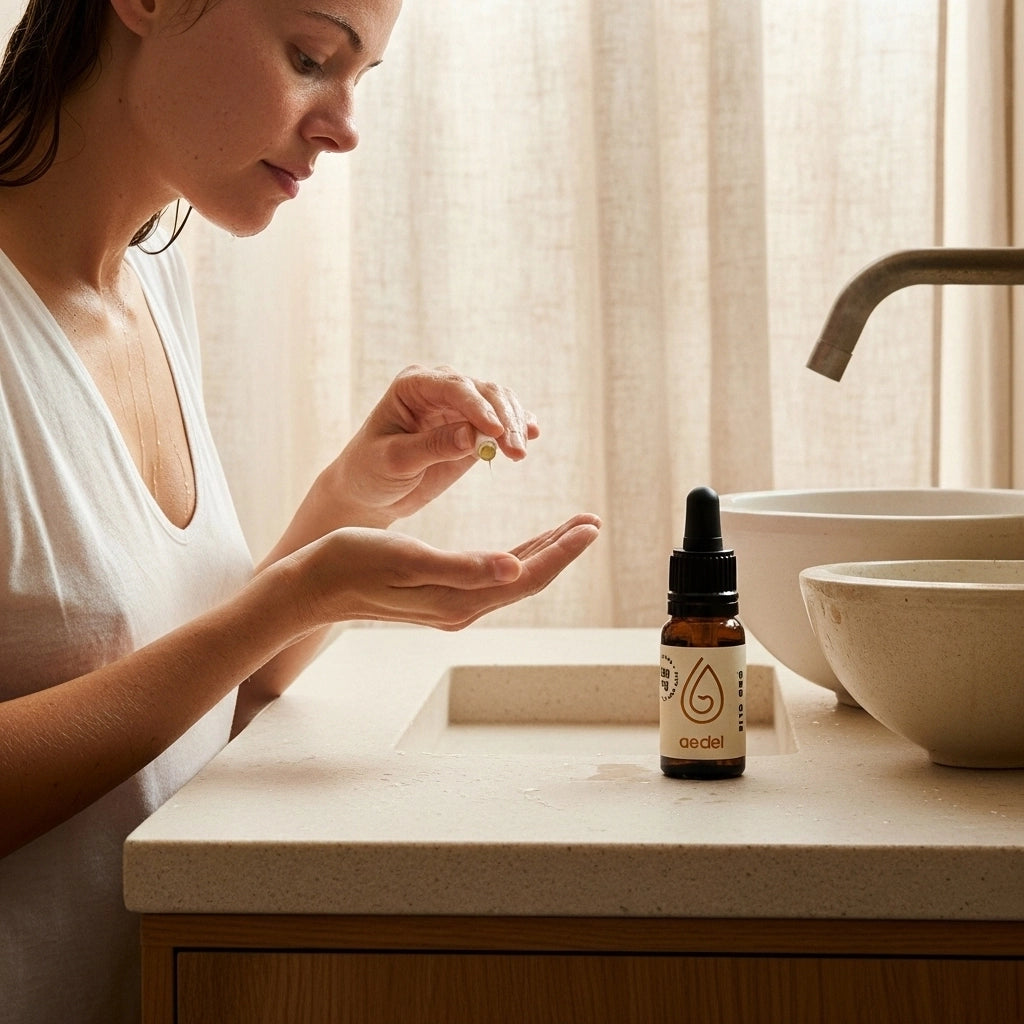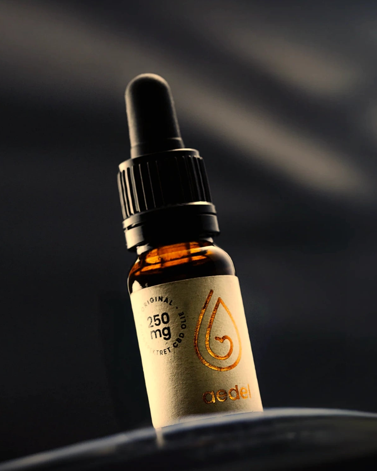 Placer 1–3 dråber Aedel CBD olie under tungen, hold ca. 60 sek. og synk. Start morgen/aften i 3–7 dage og justér roligt efter behov.